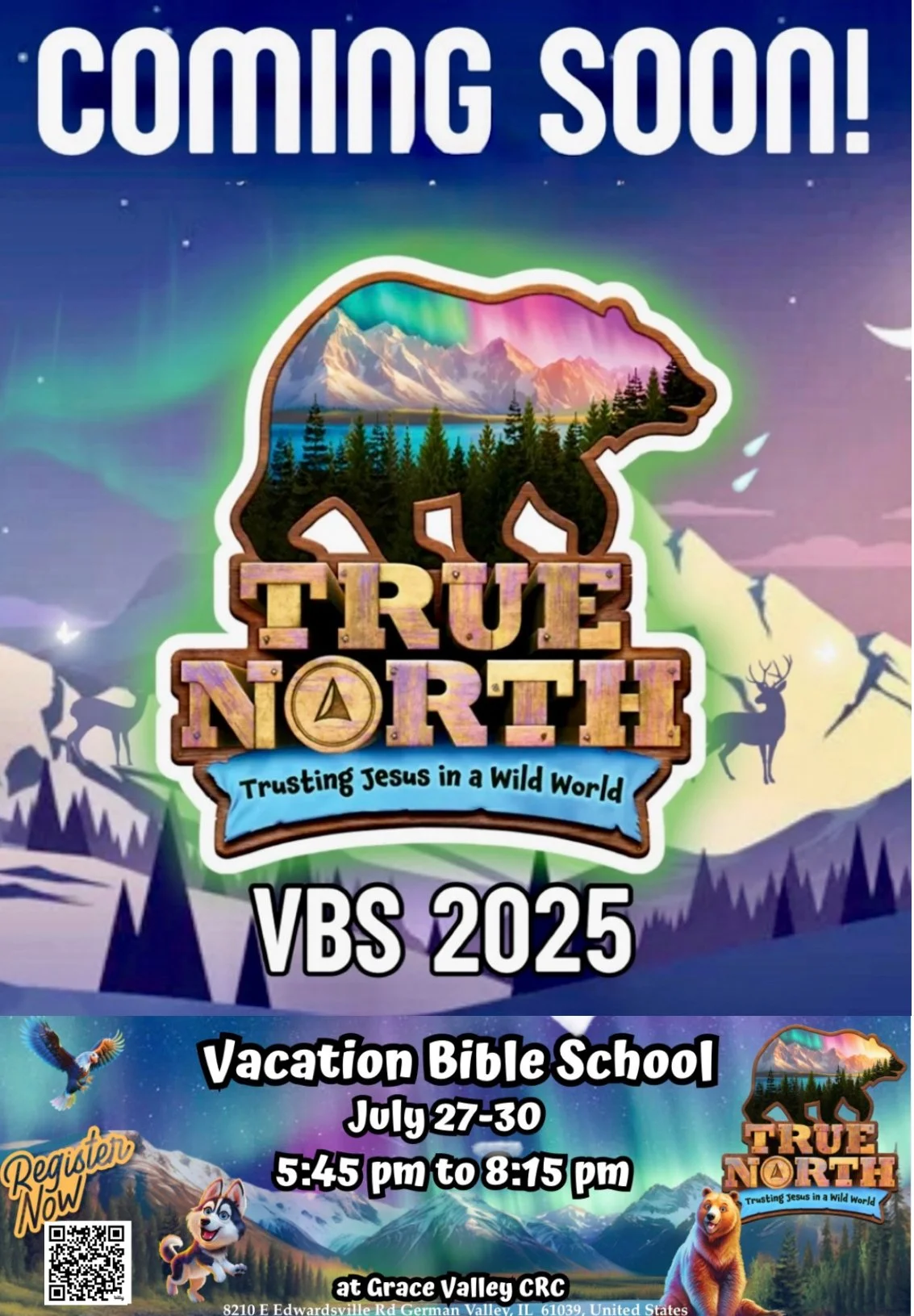 Join us here at Grace Valley CRC, August 6-9, from 5:45 - 8:30 p.m. for Vacation Bible School. Click the link on our home page to register!